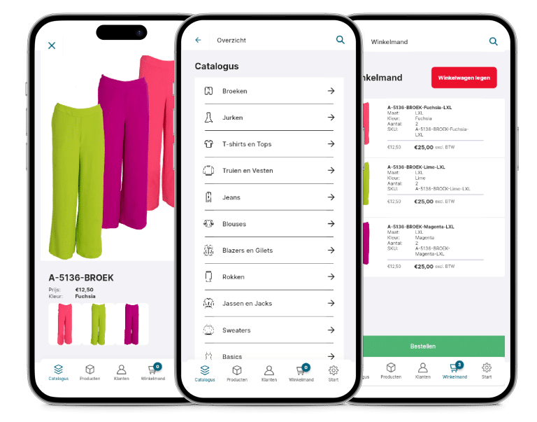 Wenn Kunden den Showroom besuchen, werden sie von Mitarbeitern unterstützt, die über die App direkt Bestellungen aufnehmen. Alle Produkte sind übersichtlich kategorisiert und lassen sich einfach mit spezifischen Optionen wie Farbe und Größe ergänzen. Die Produktinformationen werden automatisch aus dem PIM-System geladen, sodass die Daten stets aktuell sind.